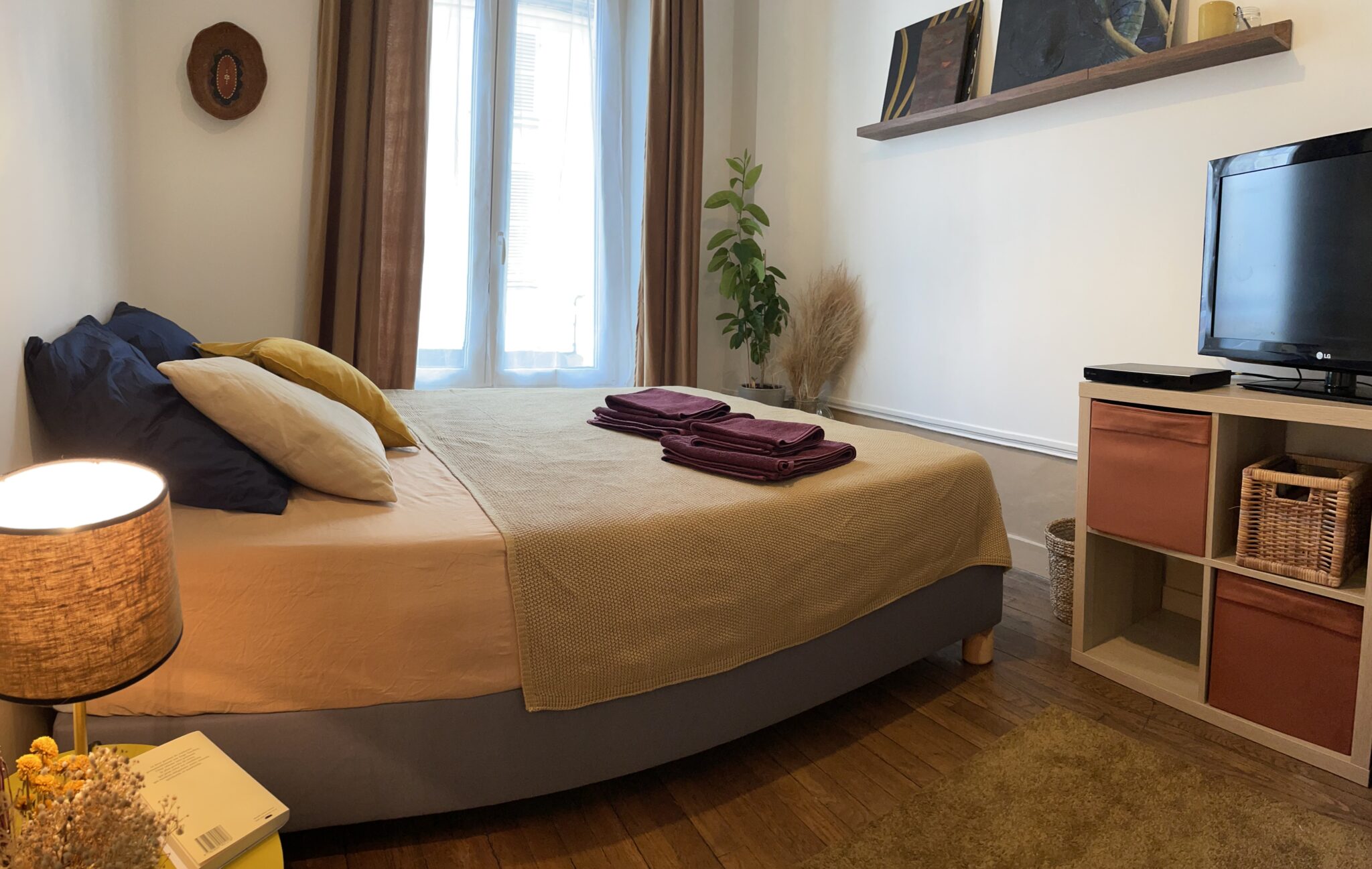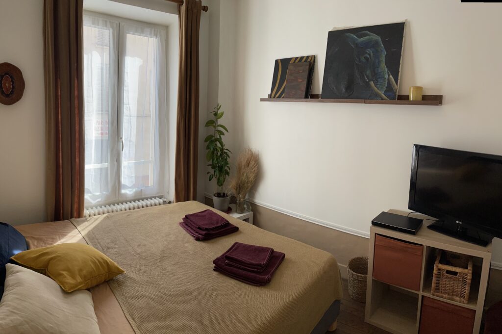 Cette dernière dispose d’un lit double 160, d’une TV avec lecteur DVD, de Wifi haut débit, du linge de maison fourni (serviettes de bains, draps) .